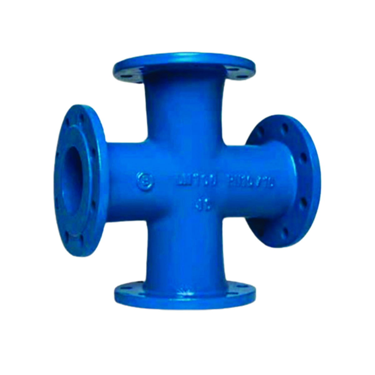 Хрестовина чавунна фланцева - фітинг чавунний фланцевий використовується в різних інженерних системах для відведення труб при монтажі трубопроводів в місцях зміни напрямку та розгалуження потоку робочої середовища та в місцях з'єднання з трубопроводною арматурою. Сучасні технології лиття надають чугуну, який застосовується як матеріал виготовлення, високі технічні характеристики. Він володіє високою зносостійкістю, міцністю та здатним витримувати значні навантаження і тиск грунту в разі підземної прокладки. Монтаж пристрою не вимагає складного обладнання та високого рівня кваліфікації виконавців робіт. Матеріал корпусу: високоміцний чугун згідно EN-GJS-500-7; Покриття: порошкове покриття 250 мікрон, згідно RAL 5015; Розсвердлення фланців згідно з DIN 2501 PN10/PN16; Допустимий робочий тиск Pn16; Робоча температура від 0 до +70 °C.